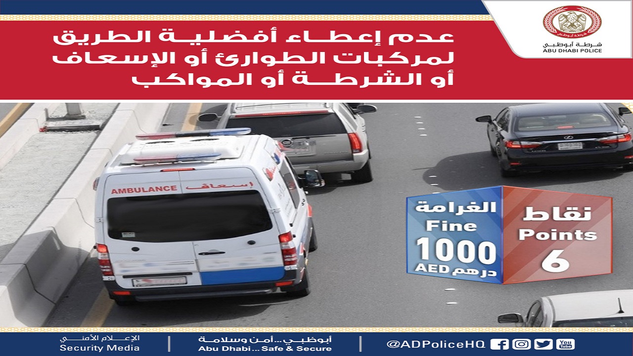 جدير بالذكر ان مخالفة عدم اعطاء افضلية الطريق لمركبات الطوارئ او الاسعاف او الشرطة او المواكب الرسمية الغرامة 1000 درهم و6 نقاط مرورية .