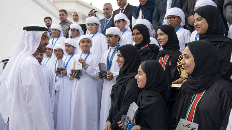 جاء ذلك خلال استقبال صاحب السمو الشيخ محمد بن زايد آل نهيان، أمس، في مجلس قصر البحر، وفد «المدرسة الإماراتية» الفائزة بالمركز الثاني عالمياً، خلال مشاركتها في البطولة العالمية للذكاء الاصطناعي والروبوت «فيكس» التي أقيمت منافساتها أخيراً في ولاية كنتاكي الأميركية، بمشاركة 790 فريقاً يمثلون 50 دولة.