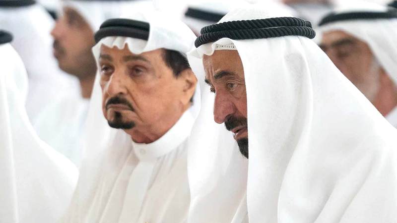 حكام الشــارقة وعجمـان وأم القيــــوين ورأس الخيمة يؤدون صلاة الجنازة على جثمان خــــالد بن سلطان