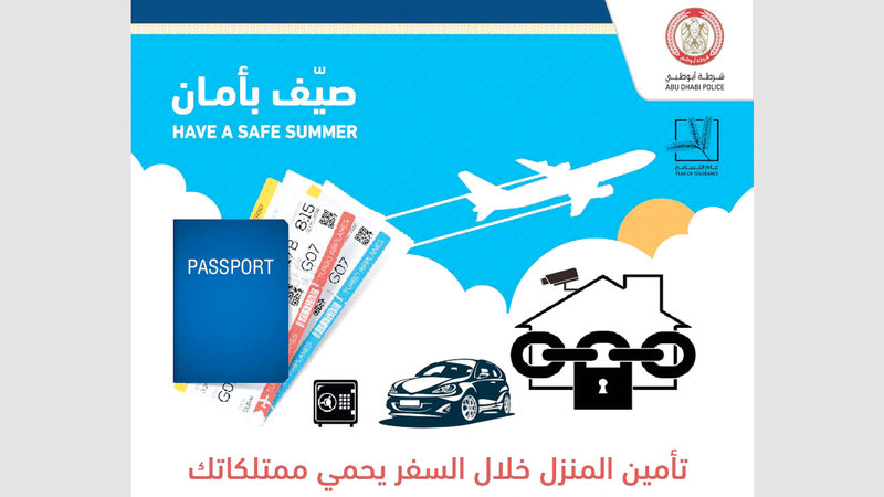 دعت شرطة أبوظبي الجمهور إلى ضرورة الحفاظ على الممتلكات وأخذ التدابير الوقائية، قبل مغادرة المنازل بنية السفر، وذلك في إطار حملة «صيّف بأمان».