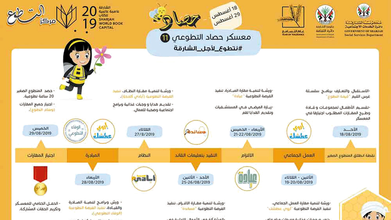 ينفذ مركز التطوع، التابع لدائرة الخدمات الاجتماعية بالشارقة، خلال الفترة من 18 إلى 29 أغسطس الجاري، الدورة الـ11 لمعسكر «حصاد» التطوعي، التي تستهدف ترسيخ قيم التسامح تجاه العمال، وكبار السن، وتنمية روحه لدى الأجيال الناشئة.