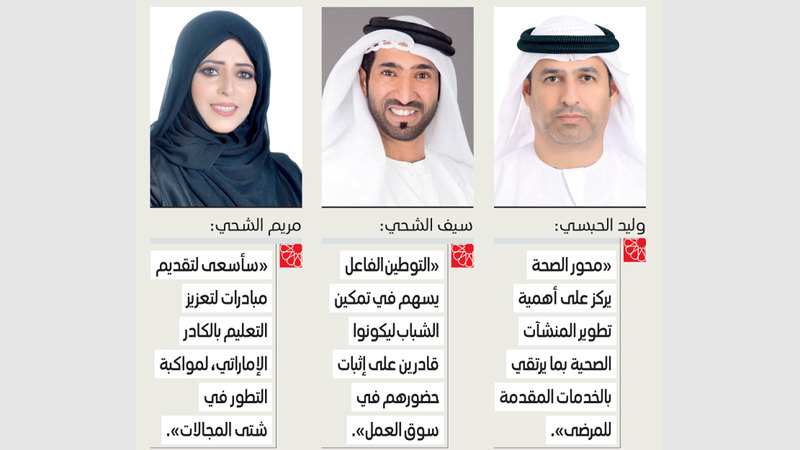 وحول محور الصحة أفادت الشحي بأنها ستناقش دور وزارة الصحة في تطوير الكوادر المؤهلة في المستشفيات، وتوفير الرعاية الصحية لكبار المواطنين، خصوصاً الرعاية المنزلية، وتوفير التأمين الصحي لشرائح المجتمع، خصوصاً المطلقات والأرامل.