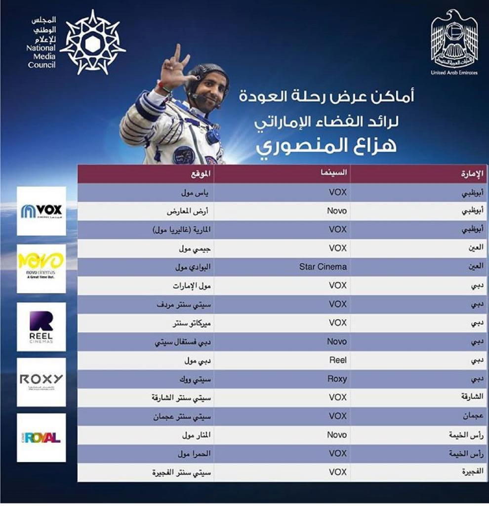 أعلن المجلس الوطني للإعلام أن عودة رائد الفضاء الإماراتي هزاع المنصوري من محطة الفضاء الدولية ستبث غدا الخميس مباشرة في 16 دار سينما من الساعة 1:30 الى 3:30 ظهراً، في كل من أبوظبي (3 دور سينما)، والعين (داران)، ودبي (6 دور)، والشارقة دار سينما سيتي سنتر، و عجمان (ستي سنتر عجمان)، ورأس الخيمة (داران)، والفجيرة (سيتي سنتر الفجيرة).