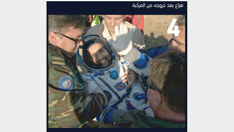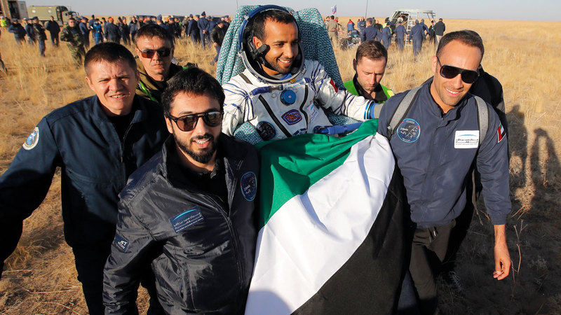 وكان أول رائد فضاء إماراتي هزاع المنصوري، وصل إلى الأرض بعد الرحلة التاريخية إلى محطة الفضاء الدولية، التي استغرقت ثمانية أيام، أجرى خلالها مجموعة من التجارب العلمية المكثفة، حيث هبطت المركبة «سويوز إم إس 12»، التي تقل المنصوري، ورائدي الفضاء الأميركي نيك هيج، والروسيّ أليكسي أوفشينين، في منطقة سهلية جنوب شرق مدينة جيزكازجان في كاراغندا، وسط كازاخستان، في تمام الساعة الثانية و59 دقيقة من بعد ظهر أمس، ونُقل المنصوري إلى مدينة النجوم في روسيا، وسيخضع للملاحظة لمدة أسبوعين إلى ثلاثة أسابيع.