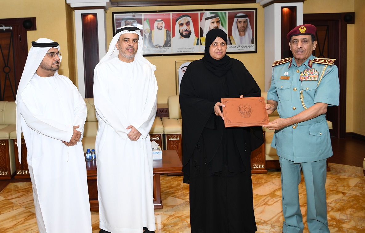 قائد عام شرطة رأس الخيمة يُكَرِّم مواطنة تقديراً لتطوعها يومياً في تنظيم حركة السير