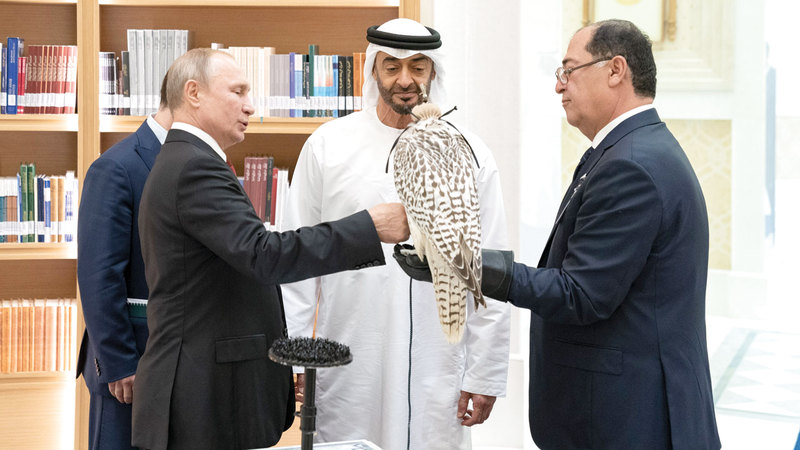 وتبادل صاحب السمو الشيخ محمد بن زايد آل نهيان، ورئيس جمهورية روسيا الاتحادية، فلاديمير بوتين، الهدايا التذكارية، حيث أهدى سموه للرئيس فلاديمير بوتين مجسماً لقلعة الحصن التاريخية، فيما قدم الرئيس الروسي لسموه صقراً يعد أندر أنواع الصقور في روسيا. وسجّل الرئيس الروسي كلمة بسجل كبار الزوار في قصر الرئاسة، أعرب خلالها عن سعادته بزيارة دولة الإمارات، وجزيل شكره وتقديره لحفاوة الاستقبال والضيافة اللذين حظي بهما والوفد المرافق، متمنياً للعلاقات الثنائية بين البلدين مزيداً من التطور والازدهار، ولدولة الإمارات وشعبها دوام التقدم.