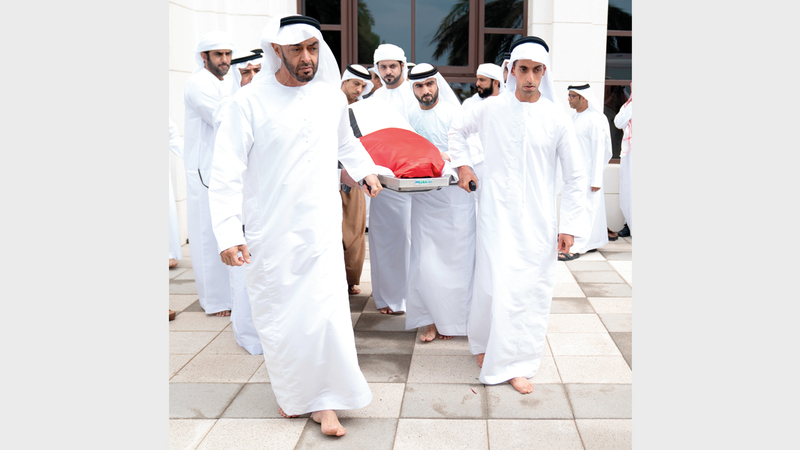 محمد بن زايد والحكام وأوليـاء العهود والشيوخ يؤدون صلاة الجنازة على جثمان سلطان بن زايد