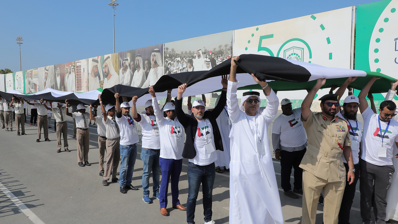 وفي مشهد رائع بميدان وساحات أكاديمية شرطة دبي، حُمل علم دولة الإمارات العربية المتحدة عالياً لمسافة 100 متر بمشاركة من جمهور متنوع من مواطنين وموظفين وطلاب ومن مختلف الجنسيات والديانات والأعراق والاختلافات من المقيمين والزائرين للدولة، راسماً بذلك لوحة فنية عنوانها التسامح والتعايش وقبول الآخر، والذي يعبر عن واقع دولة الإمارات العربية، وتناغم مجتمعها إحتفاءاً بعام التسامح.