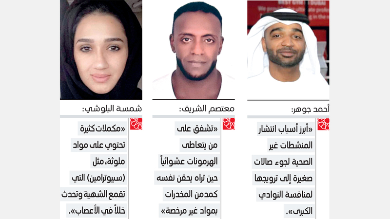 وفيما أصدرت دائرة الصحة في أبوظبي، أخيراً، قائمة تضمنت 157 مكملاً غذائياً مغشوشاً، حذّرت هيئة الصحة في دبي من تناول المكملات دون إشراف طبي، مشيرة إلى أن «أغلبية الصالات الرياضية تتاجر في هذه المنتجات، دون التعاقد مع أطباء أو مختصين للإشراف على تناولها».