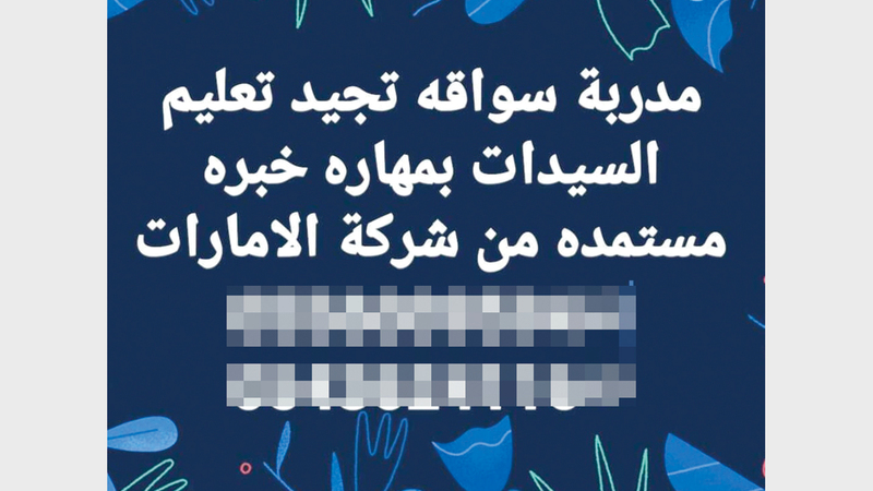 وعرض شخص من جنسية عربية تدريب قيادة السيارات للمقيمين، وتواصلت معه «الإمارات اليوم» فأبلغها بأن سعر الحصة 75 درهماً لمدة ساعة ونصف الساعة، مؤكداً تعليم الشخص كيفية القيادة وأهم اللوائح التي يتعين التقيد بها، خلال حصتين فقط.