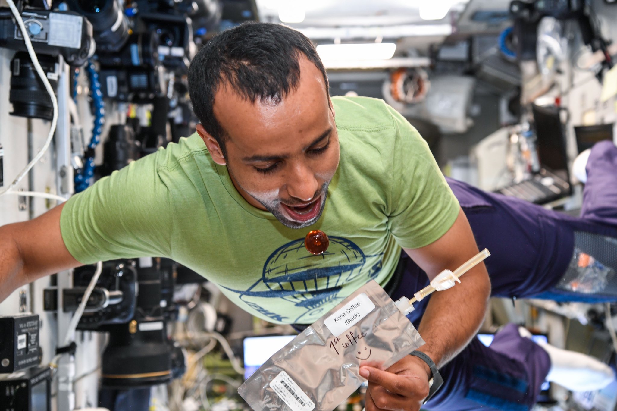 شرح رائد الفضاء الإماراتي، هزاع المنصوري، طريقة إعداد كوب من القهوة على متن محطة الفضاء الدولية.