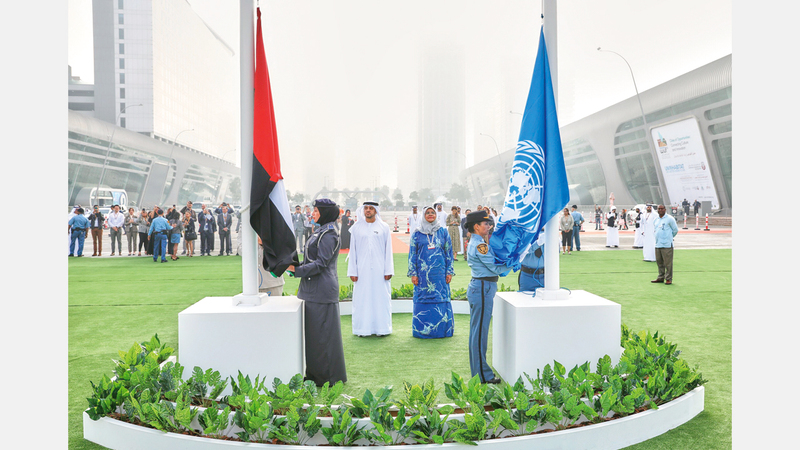 جانب من مراسم رفع علمَي الإمارات والأمم المتحدة. من المصدر