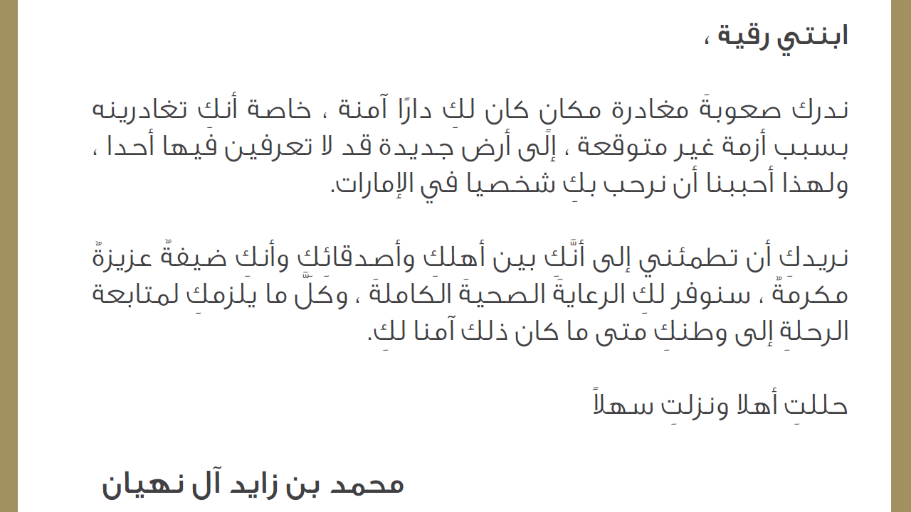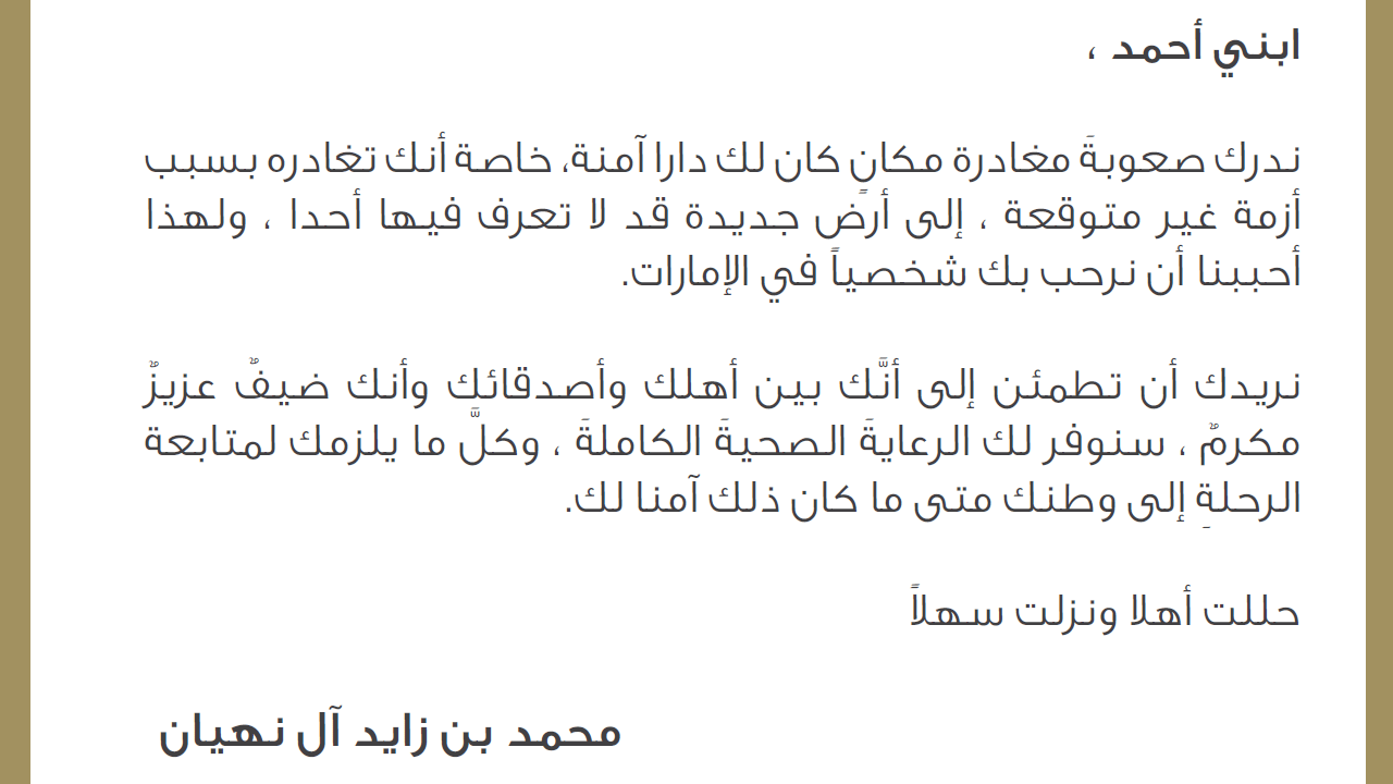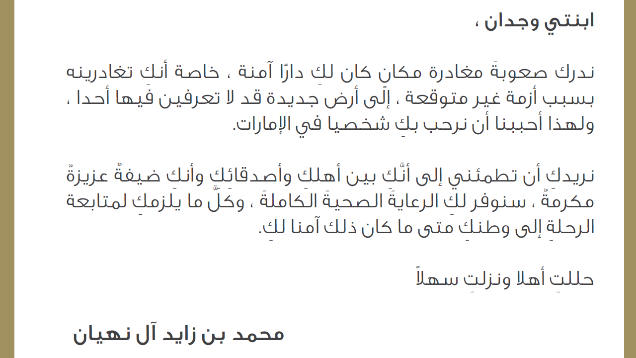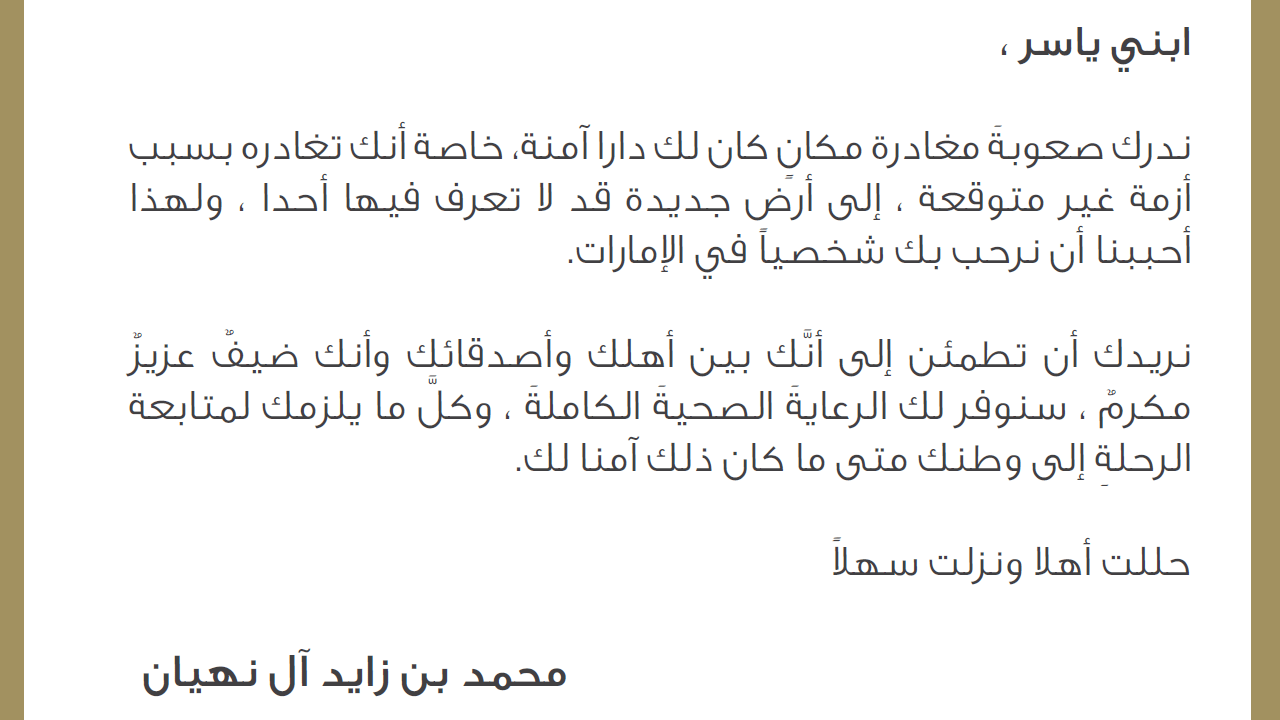 واضاف سموه: "نريدك أن تطمئن إلى أنك بين أهلك وأصدقائك وأنك ضيف عزيز مكرم، سنوفر لك الرعاية الصحية الكاملة، وكل ما يلزمك لمتابعة الرحلة إلى وطنك متى ما كان ذلك آمناً لك".