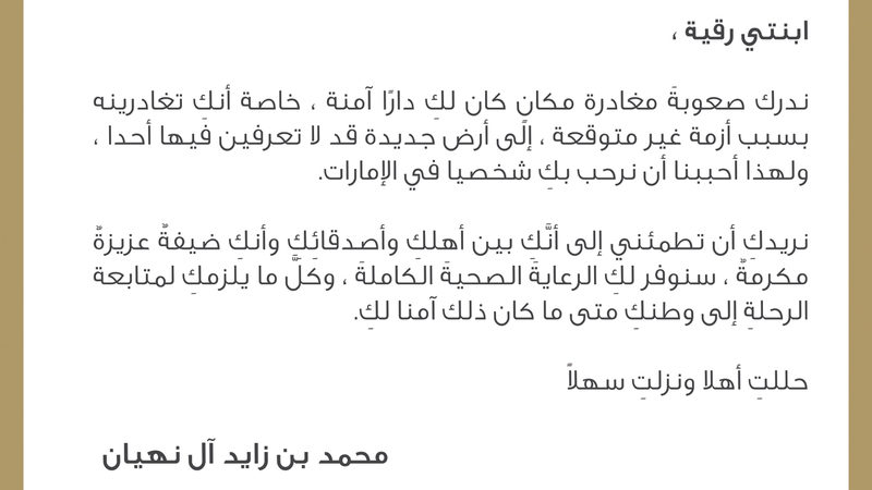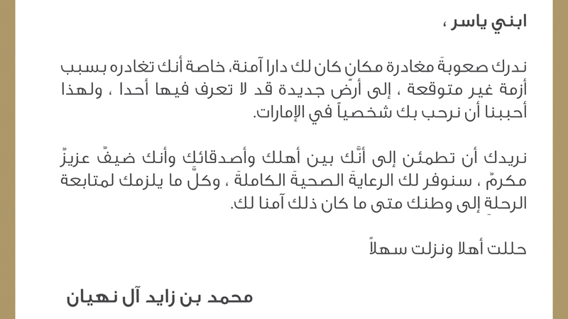 وأشار إلى أنه «تم تجهيز مدينة الإمارات الإنسانية، التي تستوعب مئات الأسر، بكل الوسائل لاستقبال الأشقاء والأصدقاء، والتعامل مع جميع الفئات العمرية، وتلبية متطلباتهم واحتياجاتهم الشخصية والعامة».