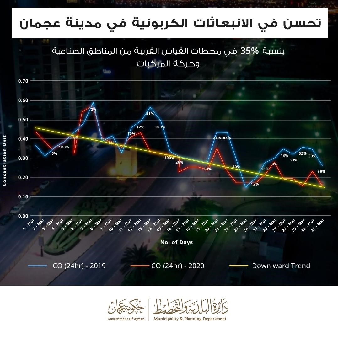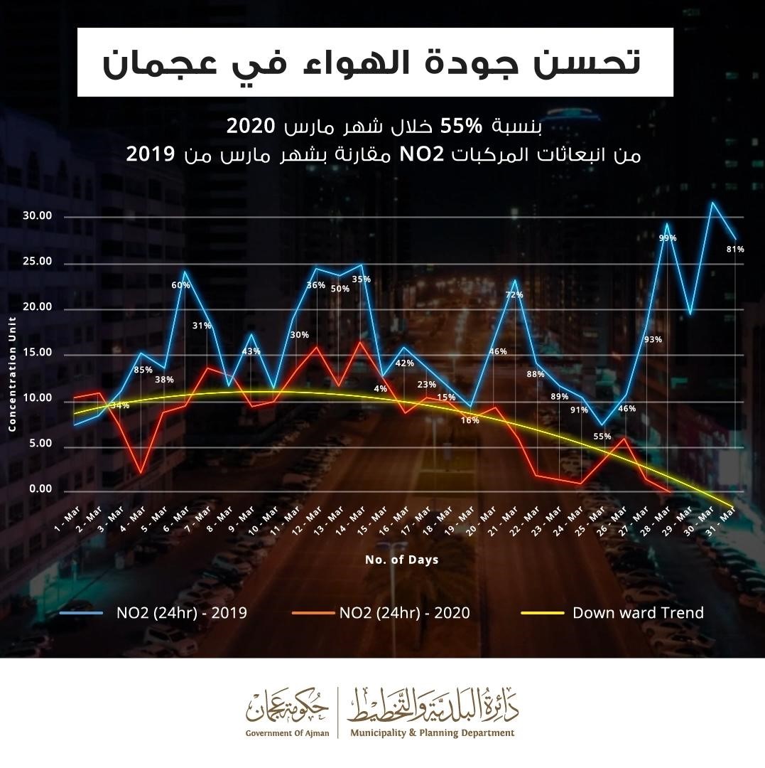 أكدت دائرة البلدية والتخطيط في عجمان، أن التقارير كشفت عن تحسّن ملحوظ في جودة الهواء لبعض الغازات بنسبة تصل إلى 55%، والتي تأتي نتيجة إجراءات البرنامج الوطني للتعقيم وتقييد حركة المركبات، وتتمثل متابعة الدائرة لجودة الحياة برقابتها على مدار الساعة في ظل الظروف الحالية، وتسخير أحدث التقنيات العالمية، مثل تبنيها المركبة التي تعمل بالذكاء الاصطناعي للرقابة الفورية للانبعاثات.