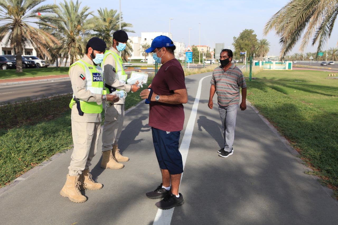 نفذت مديرية المرور والدوريات بقطاع العمليات المركزية بشرطة أبوظبي مبادرة تحت شعار من «أجل سلامتكم» تضمنت توزيع الكمامات والقفازات على ممارسي رياضة المشي وحثهم على التقيد بالتدابير الاحترازية التي تطبقها الدولة حاليا للوقاية من جائحة كورونا.