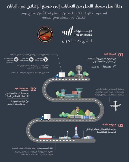 أما المرحلة الثانية، من مطار آل مكتوم الدولي إلى مطار ناغويا في اليابان، ومدة الرحلة 11 ساعة، ورافق المسبار في طائرة الشحن مجموعة من فريق المشروع للقيام بمراقبة سلامته طوال الرحلة، ثم المرحلة الثالثة، وهي من مطار ناغويا إلى موقع الإطلاق في جزيرة تانيغاشيما، إذ نقل المسبار براً من المطار إلى ميناء شيماما، ثم نقله بحراً إلى جزيرة تانيغاشيما حيث تمتد الرحلة إلى 44 ساعة.