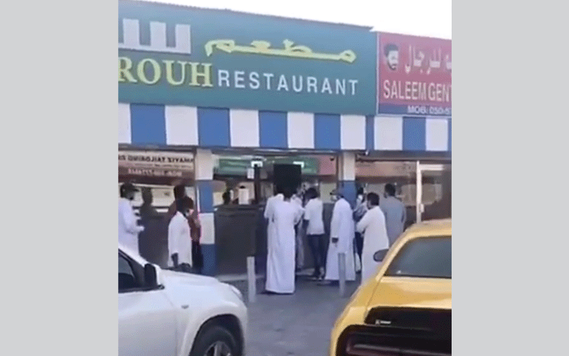 تداول رواد التواصل الاجتماعي فيديو لتجمع عدد من الزبائن أمام أحد المطاعم المتخصصة في بيع السمبوسة والباكورة في إمارة رأس الخيمة، دون أي مراعاة للظروف الصحية الراهنة ودون تطبيق إجراءات التباعد أو ارتداء الكمامات والقفازات من قبل بعض الزبائن.