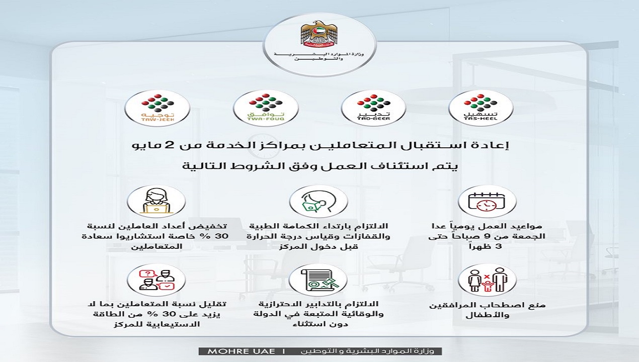ووفقاً للوزارة تضمنت أبرز الشروط لدخول أي من مراكز الخدمة الأربعة التابعة لها، الالتزام بارتداء الكمامة والقفازات وإجراء قياس لدرجة الحرارة قبل الدخول، منع اصطحاب المرافقين والأطفال، الالتزام بأي تدابير احترازية أخرى تقرها الدولة من دون استثناء، تخفيض نسبة المتعاملين بما لايزيد على 30% من إجمالي الطاقة الاستيعابية للمركز، بالإضافة إلى التزام المركز بتخفيض أعداد العاملين لديه إلى ما لا يزيد على 30 % ولاسيما في خدمة إسعاد المتعاملين.