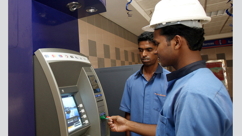 عامل مستفيد من نظام حماية الأجور لدى تقاضيه راتبه من جهاز الصراف. أرشيفية