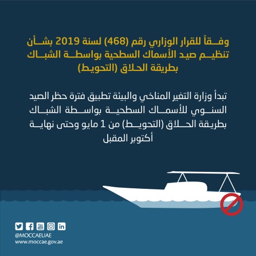 وذكرت الوزارة أن القرار يأتي في اطار حرص الوزارة على تنظيم مواسم الصيد وموائمتها بالفترات الزمنية التي تتناسب مع طرق الصيد المعمول بها في الدولة ولإتاحة الفرصة للصيادين الاستفادة من مزاولتهم حرفة الصيد مع مراعاة كافة الاعتبارات الكفيلة بحماية البيئة البحرية واستدامة مخزون الثروة السمكية لضمان العمل بحرفة الصيد ووصولها الى أجيال المستقبل، وتتنوع طرق صيد الأسماك السطحية بالدولة ويختلف وفرتها ومواقع تجمعاتها بحسب المواسم على مدار فصول السنة وتصاد بطرق مختلفة منها شباك الحلاق والخيط والصنارة بالحداق أو اللفاح وأيضا الضغوة والمناصب الثابة و الحظور في حال تواجد هذه الأسماك بالمناطق الساحلية.