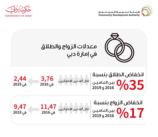 كشف تقرير إحصائي أعده مركز دبي للإحصاء بالتعاون مع هيئة تنمية المجتمع ومحاكم دبي حول معدلات الطلاق والزواج في إمارة دبي على مدار أربع سنوات، انخفاضاً في الطلاق بنسبة 35% بين العامين 2016 و2019 حيث انخفض معدل الطلاق لكل ألف بين الإماراتيين من 3,76 في العام 2016 إلى 2,44 في العام 2019. تضمن ذلك كافة حالات الطلاق التي يكون بها أحد الطرفين أو كلاهما إماراتيين.