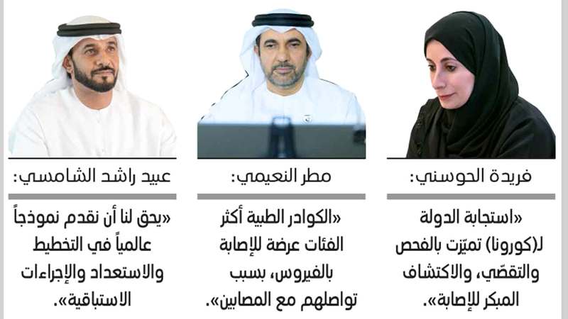 وقالت الحوسني إن استجابة الإمارات لوباء كورونا تميزت بالتركيز على الفحص والتقصي والاكتشاف المبكر للحالات، ما ساعد على التدخل السريع والحد من انتشار الفيروس.