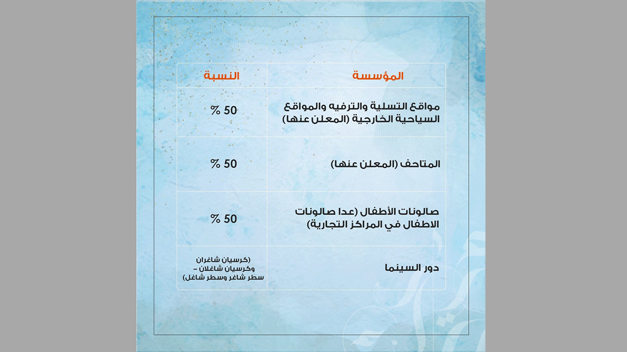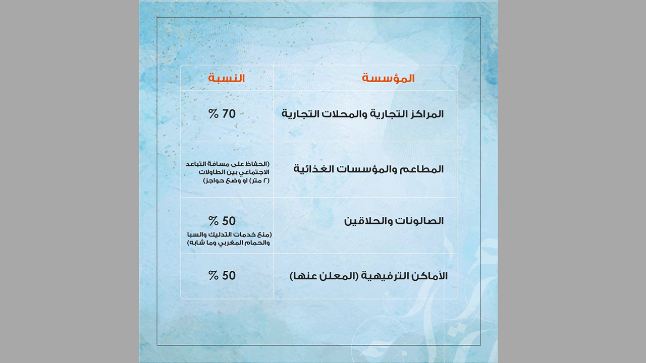 وننشر هنا بالصور نسب الإشغال المطلوبة في المراكز التجارية، ومرافق الترفيه والخدمات بالإمارة بما يتناسب مع ضرورات المرحلة المقبلة وحاجات المواطنين والمقيمين، حسب بيانات بلدية دبي: