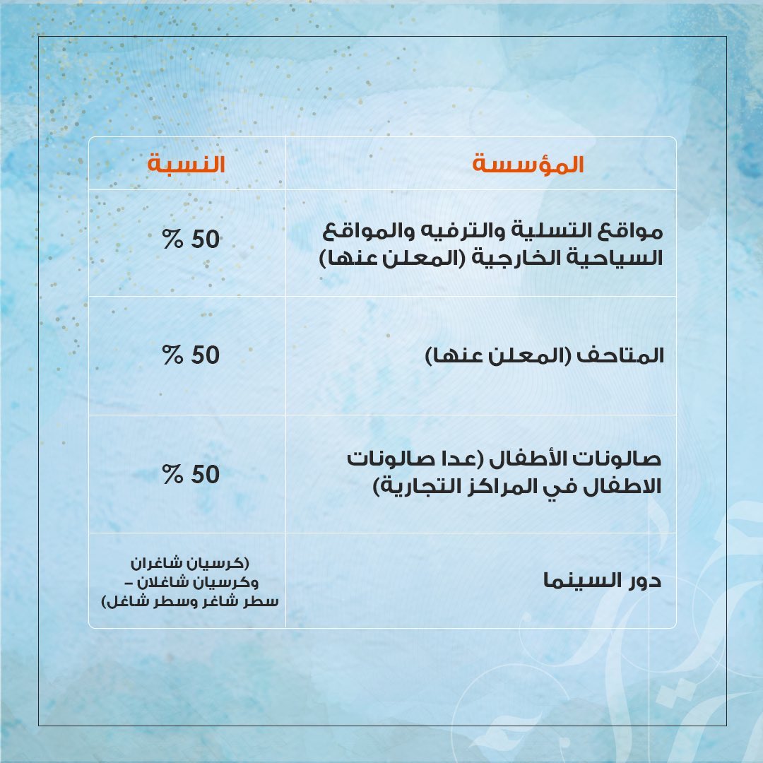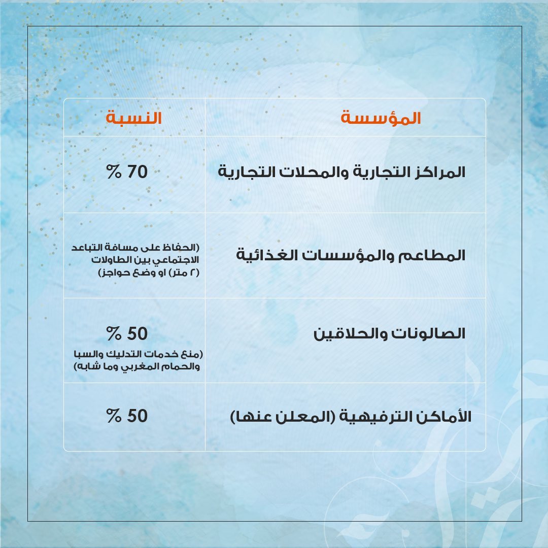 وننشر هنا بالصور نسب الإشغال المطلوبة في المراكز التجارية ومرافق الترفيه بالإمارة بما يتناسب مع ضرورات المرحلة المقبلة وحاجات المواطنين والمقيمين، حسب بيانات بلدية دبي: