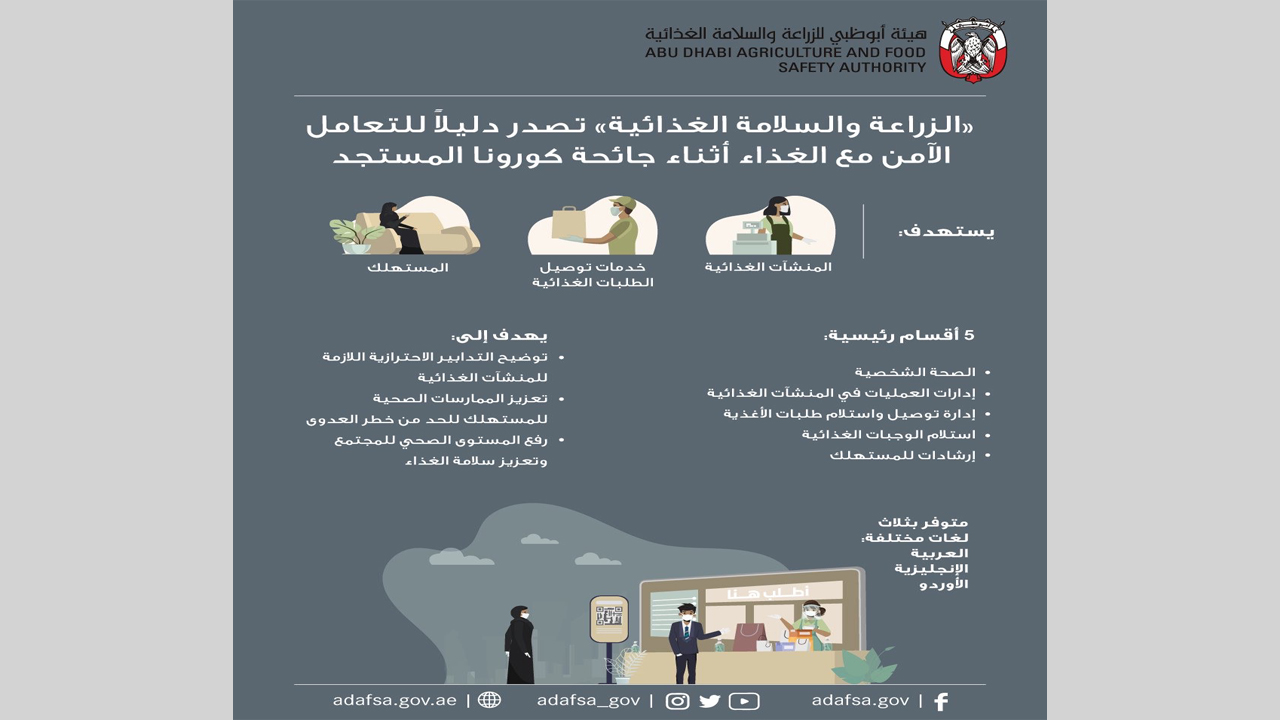 أصدرت هيئة أبوظبي للزراعة والسلامة الغذائية دليلاً بثلاث لغات- العربية والإنجليزية والأوردو- خاصاً بالإجراءات والتدابير اللازمة للتعامل الآمن مع الغذاء، وخدمات توصيل واستلام المنتجات الغذائية في ظل الظروف الراهنة.