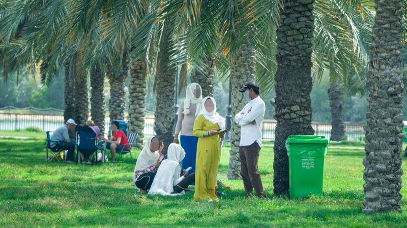 متنزهون تجاهلوا ارتداء الكمامات على كورنيش بحيرة خالد في الشارقة. الإمارات اليوم
