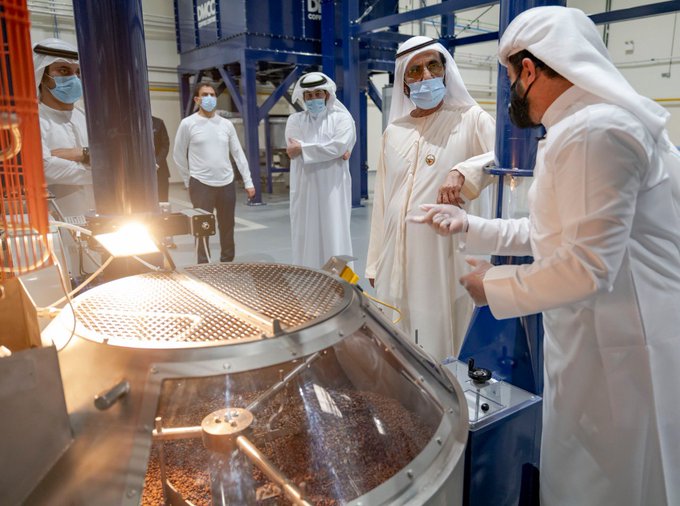 وبدأ صاحب السمو الشيخ محمد بن راشد آل مكتوم الزيارة بتفقد مركز القهوة الذي تم افتتاحه في شهر فبراير الماضي، ويُعد الأول من نوعه في منطقة الشرق الأوسط ويقدّم العديد من الخدمات المتخصّصة وتشمل: استقبال وتخزين البن الأخضر، ومعالجته، وتقييم العينات والتحميص والتعبئة، علاوة على تيسير إبرام عقود التحميص والتغليف، وتوفير خدمات الدعم اللوجستي، وذلك من خلال مقره المُقام على مساحة 7500 متر مربع.