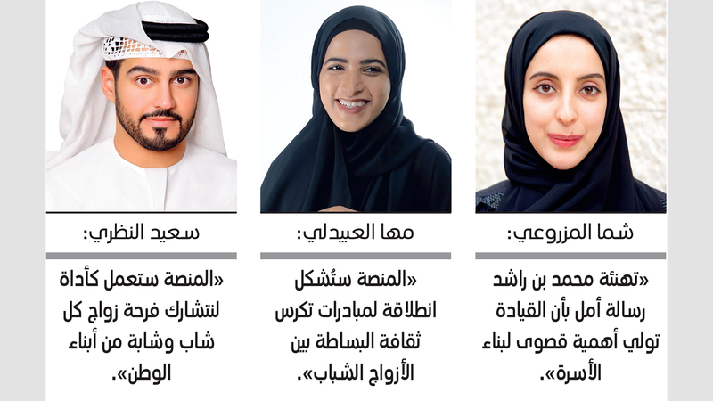 من ناحيته، قال مدير عام المؤسسة الاتحادية للشباب، سعيد النظري، إن «المنصة ستعمل كمظلة رقمية وأداة لنتشارك فرحة زواج كل شاب وشابة من أبناء الوطن، فارتباطهم هو فرحة الأسرة الإماراتية ككل، وأيضاً من أجل رصد وتوثيق التجارب الناجحة لحفلات الزواج المتوازنة والبسيطة».