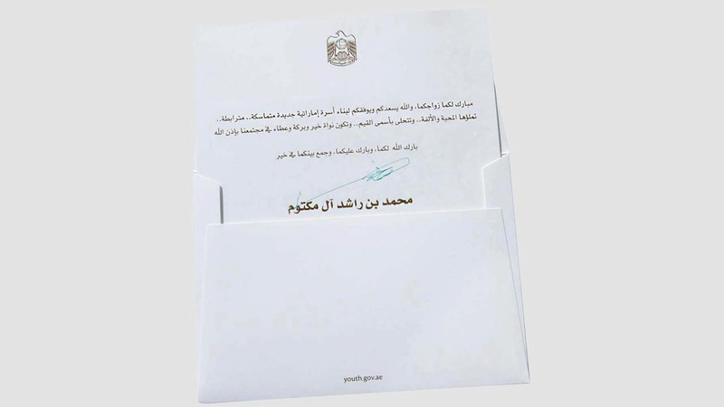 وكان صاحب السمو الشيخ محمد بن راشد آل مكتوم، فاجأ عشرات الشباب الإماراتيين من العرسان المتزوجين حديثاً، ممن نظموا حفلات زفاف بتكاليف بسيطة في منازلهم خلال فترة جائحة «كوفيد-19»، ببطاقات تهنئة خاصة موقعة من سموه، تمنّى لهم فيها زواجاً مباركاً وسعيداً، والتوفيق في بناء أسرة إماراتية جديدة متماسكة مترابطة.