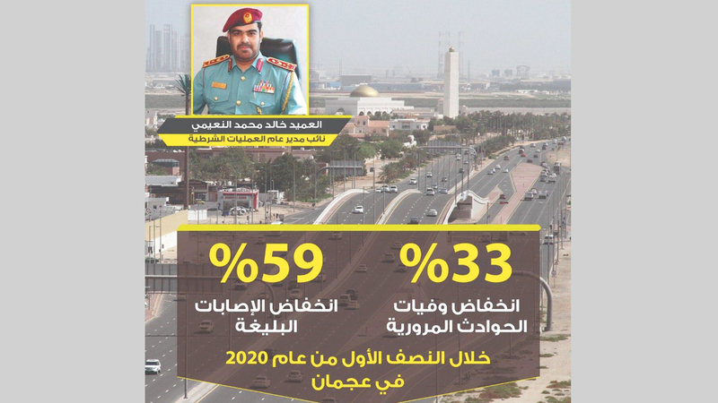 وقال نائب مدير عام العمليات الشرطية في القيادة العامة لشرطة عجمان، العميد خالد محمد النعيمي، إن الإمارة شهدت بالنصف الأول من العام الماضي وقوع 91 حادثاً جسيماً، لافتاً إلى انخفاض حوادث الدهس 53%، عن الفترة نفسها من العام الماضي، مع انخفاض عدد الإصابات الناتجة عن الحوادث المرورية بنسبة 59%.