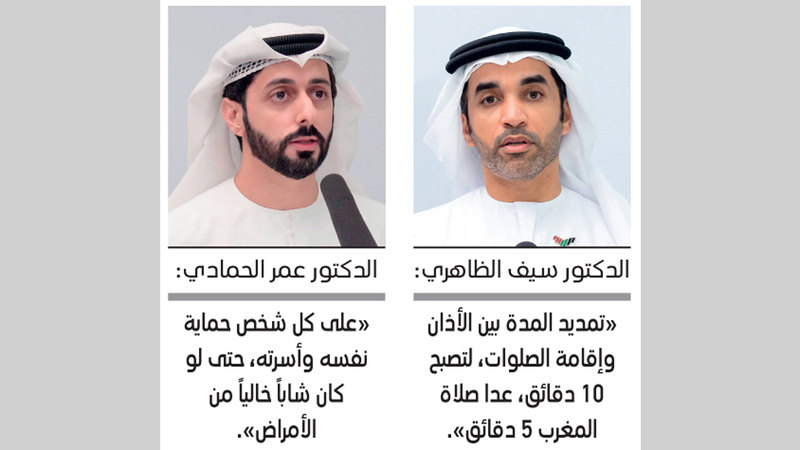 كشف المتحدث الرسمي من الهيئة الوطنية لإدارة الطوارئ والأزمات والكوارث، الدكتور سيف الظاهري، أنه تقرر بعد تقييم الوضع والتنسيق مع الجهات المعنية، أن تقام صلاة عيد الأضحى في المنازل وتبث التكبيرات من خلال الوسائل المرئية والمسموعة، مؤكداً أنه تم رفع السعة الاستيعابية للمساجد لتصبح 50%، مع الالتزام بالتباعد الجسدي مترين، وكل الإجراءات الوقائية الأخرى، وتمديد المدة بين الأذان وإقامة الصلوات لتصبح 10 دقائق، ما عدا صلاة المغرب خمس دقائق، على أن يبدأ العمل بهذه القرارات، اعتباراً من 3 أغسطس 2020.