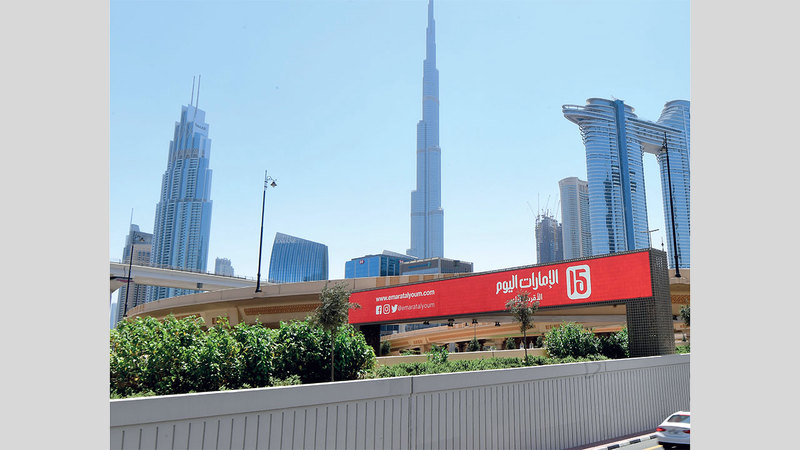 لوحة إعلانية احتفالية بـ«الإمارات اليوم»، كما بدت على أحد الجسور في دبي، وقامت هيئة الطرق والمواصلات في دبي بهذه الالتفاتة بمناسبة العيد الـ15 لتأسيس الصحيفة.