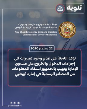 أكدت لجنة إدارة الطوارئ والأزمات والكوارث الناجمة عن جائحة كورونا في أبوظبي على عدم وجود تغييرات في إجراءات الدخول والخروج على مستوى الإمارة، وتهيب بالجمهور استقاء المعلومات من المصادر الرسمية في أبوظبي، وذلك كما ذكرت وكالة أنباء الإمارات "وام" عبر حسابها الرسمي بموقع التواصل الإجتماعي "تويتر".