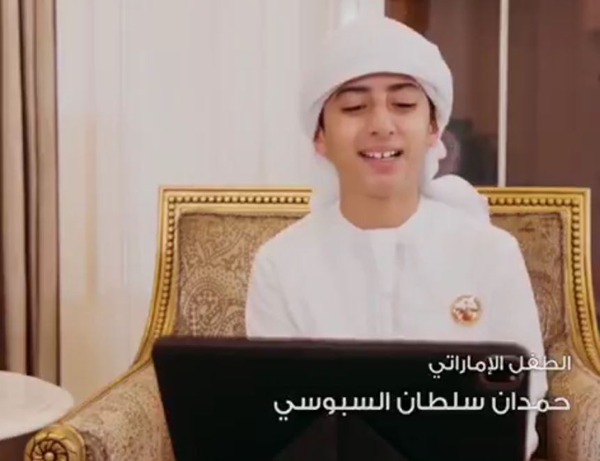 هنأ الطفل الإماراتي حمدان سلطان السبوسي الصين بيومها الوطني الـ 71، وذلك من خلال مكالمة فيديو أجراها مع الطفل الصيني ايجين ليو، تكلم من خلالها معه باللغة الصينية.