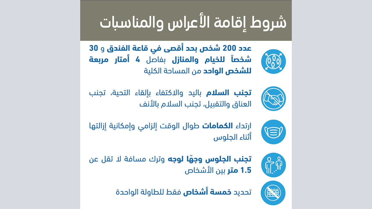 وتضمنت اشتراطات إقامة حفلات الأعراس والمناسبات الاجتماعية في الأماكن المشار إليها التالي: ألّا يزيد عدد الموجودين داخل القاعة على 200 شخص، وألّا يزيد في الخيام والمنازل على 30 شخصاً حداً أقصى، وفق الطاقة الاستيعابية للمكان، شرط أن يكون محيط الفرد الواحد للفصل عن الآخرين أربعة أمتار مربعة من المساحة الكلية للمكان، وإلزامية ارتداء الكمامات طوال الوقت، وإمكانية إزالتها أثناء الجلوس على الطاولات فقط، والحد الأقصى لعدد الحضور على الطاولة الواحدة خمسة أشخاص، وتجنّب الجلوس وجهاً لوجه أو على مسافات متقاربة (لا تقل عن 1.5 متر بين شخص وآخر).