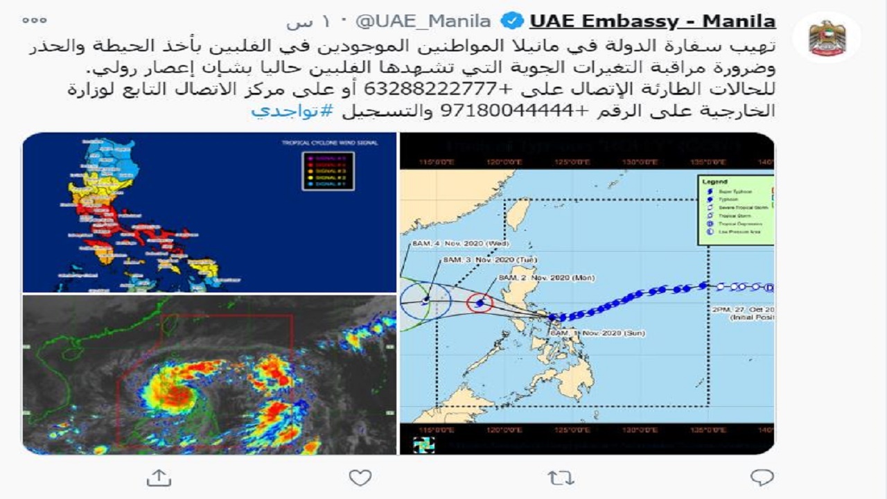 تهيب سفارة الإمارات في مانيلا بالمواطنين الموجودين في الفلبين بضرورة الحذر ومراقبة التقلبات الجوية التي تشهدها الفلبين بشأن إعصار رولي، داعية إلى الاتصال للحالات الطارئة على +63288222777 أو على مركز الاتصال التابع لوزارة الخارجية على الرقم +97180044444 والتسجيل في "تواجدي".