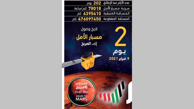 وأكد الفريق أن اللحظات الحاسمة من عُمر المهمة المريخية لبدء مهامه العلمية، ستبدأ بعد يومين، حين يباشر إبطاء سرعته من 121 ألف كيلومتر في الساعة إلى 18 ألف كيلومتر في الساعة، في فرصة وحيدة لدخول مداره العلمي بنجاح، لافتاً إلى أن «الجميع مستعد لبدء تلقي البيانات العلمية وتخزينها وتحليلها».