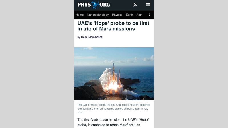 بدوره نشر موقع «phys.org» المتخصص بأخبار الفضاء والعلوم، تقريراً حول مشروع الإمارات لاستكشاف المريخ ذكر فيه أن «مسبار الأمل» الذي سيصل مدار المريخ يوم الثلاثاء، سيكون الأول من بين ثلاث مهمات فضائية أخرى ستصل إلى الكوكب الأحمر خلال شهر فبراير الجاري.