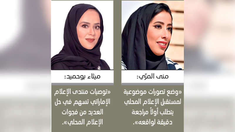 كما ركز المشاركون في المنتدى في توصياتهم على ضرورة تعزيز دور الإعلام المحلي في مخاطبة العالم، وتوصيل رسالة الإمارات على أوسع نطاق ممكن، وعدم الاكتفاء بمخاطبة الجمهور في الداخل، والعمل على تعدد الأصوات، وتنويع المحتوى الذي تتناوله الصحف المحلية، لتفادي التشابه الكبير بينها، وفتح الباب أمام المؤسسات الإعلامية الخاصة للدخول في منافسة مهنية مع نظيراتها الحكومية، لتعزيز قدرات القطاع ككل، والارتقاء بمخرجاته، وتحويل وسائل الإعلام الحكومية إلى مؤسسات تجارية خاصة، ورفع سقف التناول الإعلامي لبعض الملفات، بما يعزز دور الإعلام في خدمة الأجندة الوطنية، وتأكيد المواقف الثابتة لدولة الإمارات، ومنح الإعلام المحلي الثقة الكافية لمناقشة القضايا المتعلقة بمصلحة الوطن، وعدم التردد في توجيه النقد المسؤول والبنّاء، من منطلق حس وطني يهدف إلى معالجة السلبيات، والوصول إلى أفضل الخدمات.