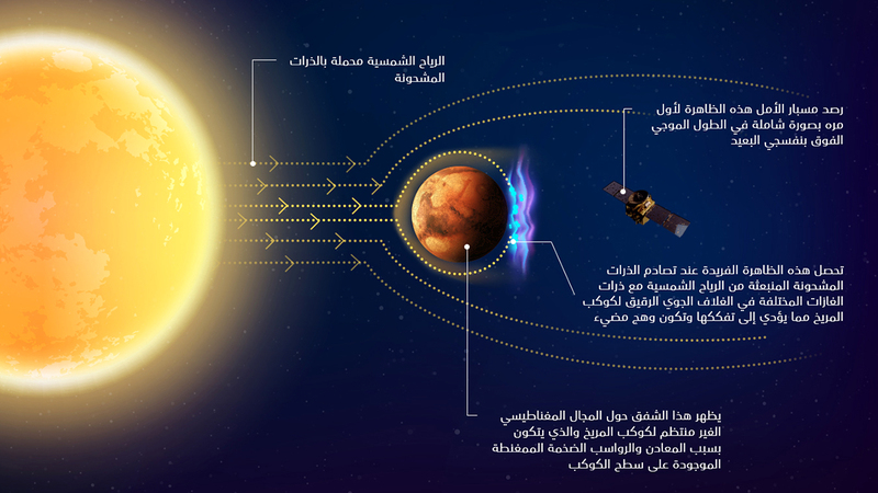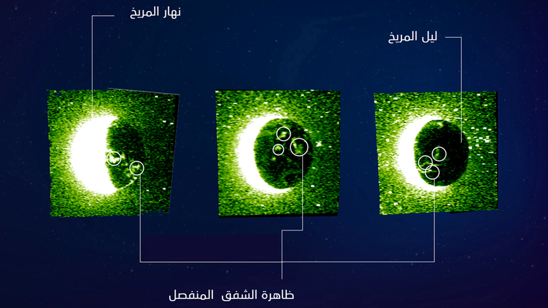 وتُظهر الصور - التي تم التقاطها بوساطة المقياس الطيفي بالأشعة فوق البنفسجية «EMUS»، الذي يحمله المسبار على متنه - وهجاً يعرف باسم «الشفق المنفصل»، تتتبع أنماطه المعقدة المناطق التي تعمل فيها المجالات المغناطيسية غير المنتظمة التي تنتجها المعادن الممغنطة الموجودة على سطح المريخ، علماً بأن هذا التأثير للحقول المغناطيسية للمريخ يعد سمة فريدة للكوكب الأحمر، حيث إنه، على عكس الأرض، لا يمتلك مجالاً مغناطيسياً شاملاً تولده نواة الكوكب، واللافت أن المقياس الطيفي بالأشعة فوق البنفسجية EMUS، وهو الجهاز العلمي الأكثر دقة واستجابةً للأشعة فوق البنفسجية حول كوكب المريخ، قادر على رصد وتصوير هذه التفاعلات الشفقية بتغطية شاملة ودقة عالية، وعبر مجموعة واسعة من الأطوال الموجية، ما يوفر فرصة غير مسبوقة لرصد ومتابعة تفاعل الغلاف الجوي مع الأنشطة الشمسية.