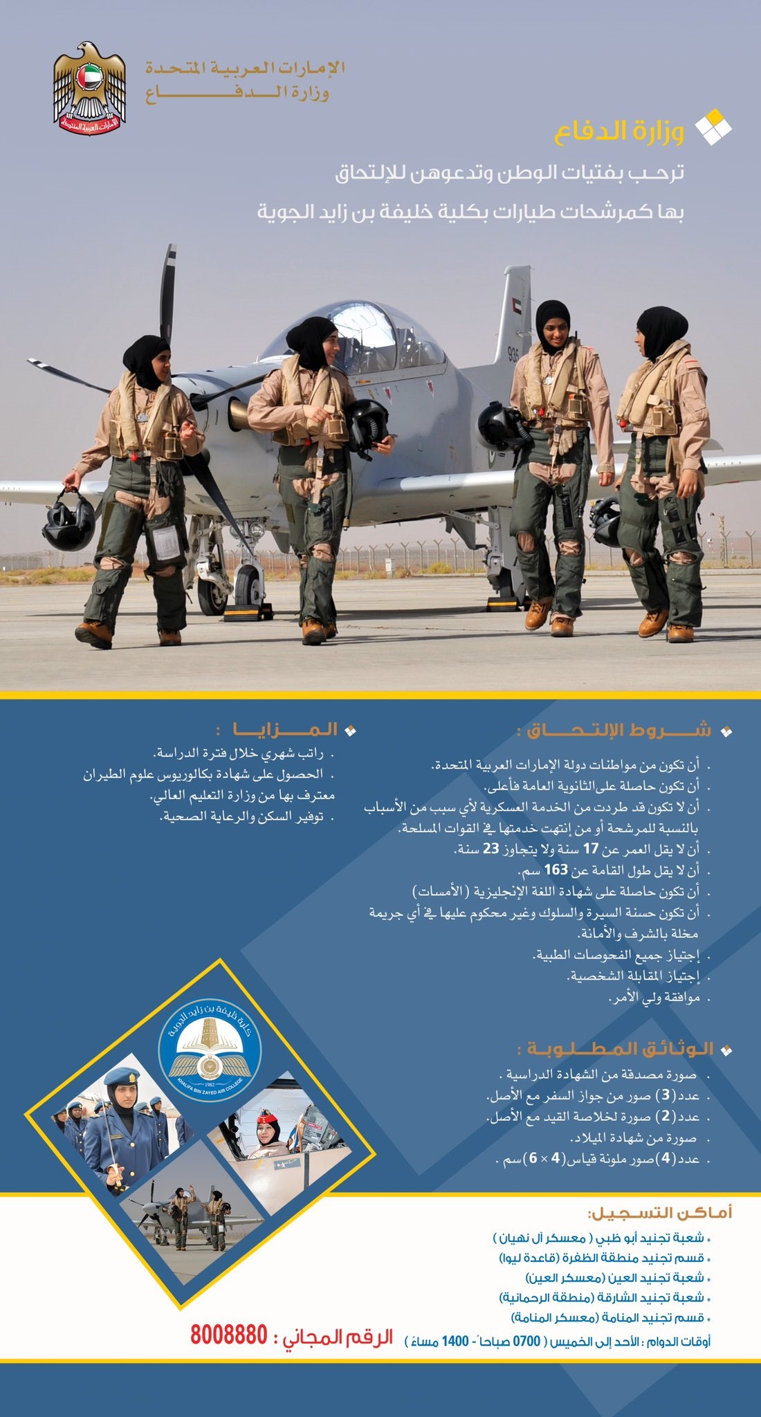 دعت وزارة الدفاع فتيات الوطن إلى الالتحاق بها كمرشحات طيارات في كلية خليفة بن زايد الجوية، مستعرضة ثلاث مزايا سوق يحصلن عليها الملتحقات، وهي راتب شهري خلال فترة الدراسة، الحصول على شهادة بكالوريوس علوم الطيران معترف بها من وزارة التعليم العالي، وتوفير السكن والرعاية الصحية.