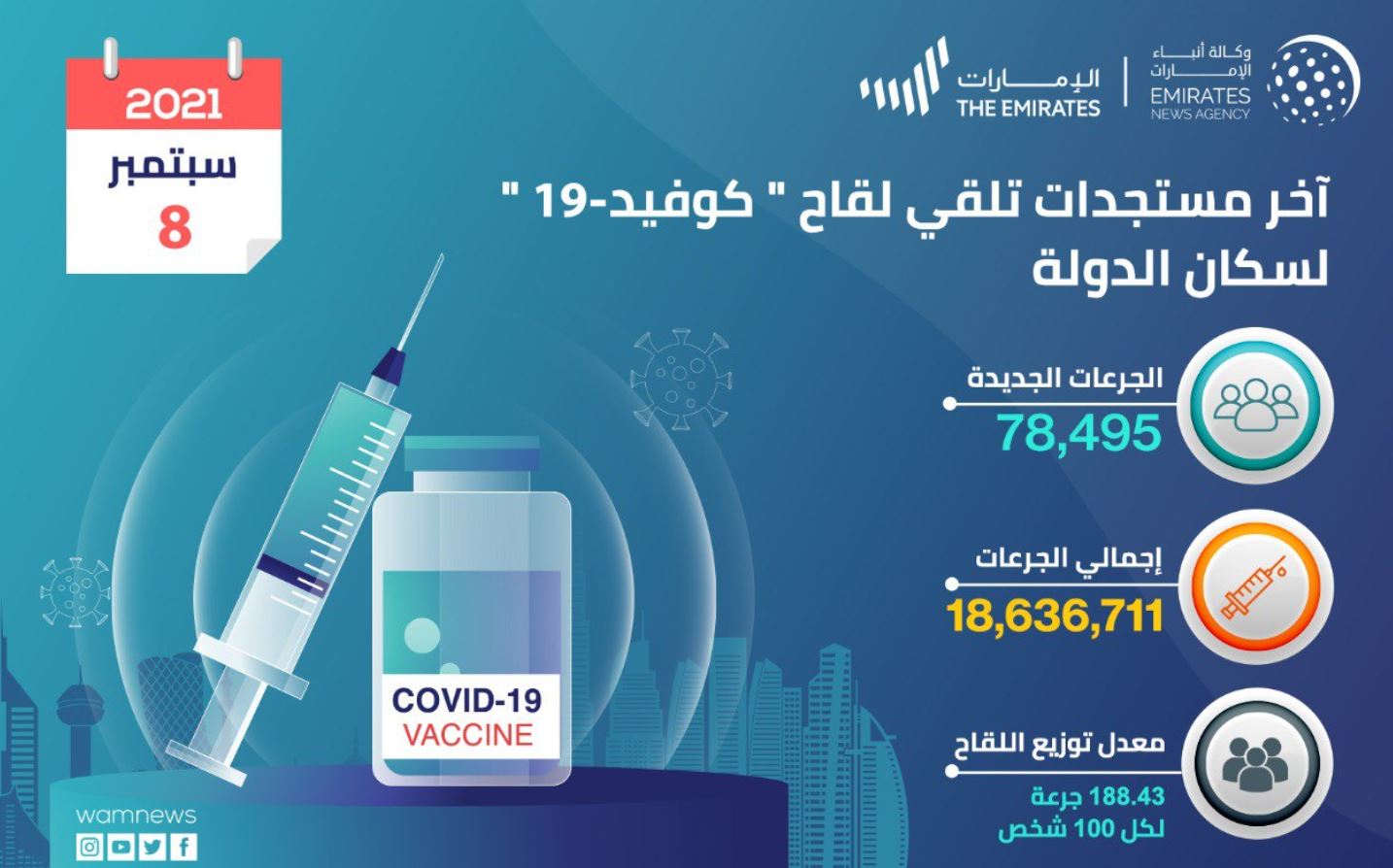 أعلنت وزارة الصحة عن 78,495 جرعة لقاح كوفيد19 تم تقديمها خلال الـ24 ساعة الماضية، ليبلغ عدد الجرعات الكلي 18,636,711 بمعدل توزيع 188.43 جرعة لكل 100 شخص. وبنسبة 89.33% لمتلقي الجرعة الأولى، ونسبة 78.12% لمتلقي جرعتين من إجمالي السكان في دولة الإمارات.