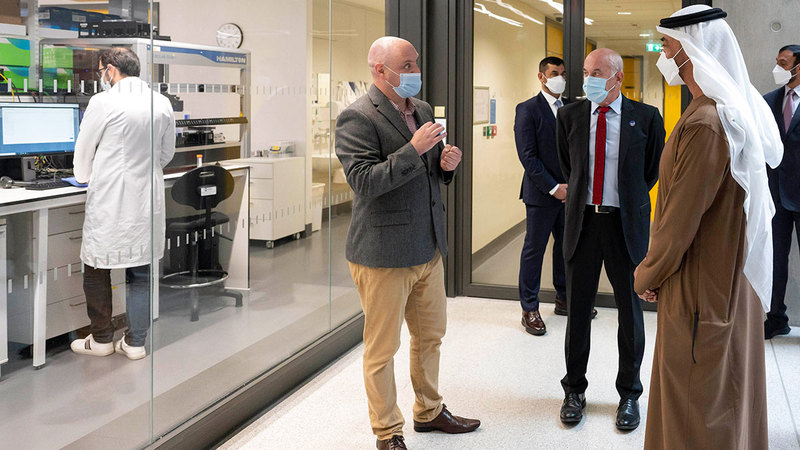 والتقى سموه خلال الجولة الباحث في مركز زايد للأبحاث، محمد العامري، المرشح لنيل درجة الدكتوراه في علم الوراثة اللاجينية لتشخيص سرطان الدم لدى الأطفال من كلية لندن الجامعية.