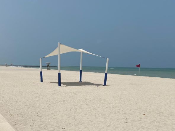 وحددت البلدية أعلاماً بألوان مختلفة على طول الشاطئ ذات دلالات مختلفة إذ يجب على مرتادي الشاطئ عدم السباحة عند رفع العلم الأحمر، وعند رفع العلم الأخضر يعني أن المياه آمنة للسباحة، والبنفسجي يدل أن هنالك خطر حيوانات بحرية (قنديل البحر، ثعبان البحر، سمك الراي اللاسع وغيرها)، ويجب السباحة بحذر عند رفع العلم الأصفر واتبع تعليمات الإنقاذ، أما العلم باللون الأحمر والأصفر يدل على أن حدود المنطقة المخصصة للسباحة بالإشراف منقذ للسباحة.