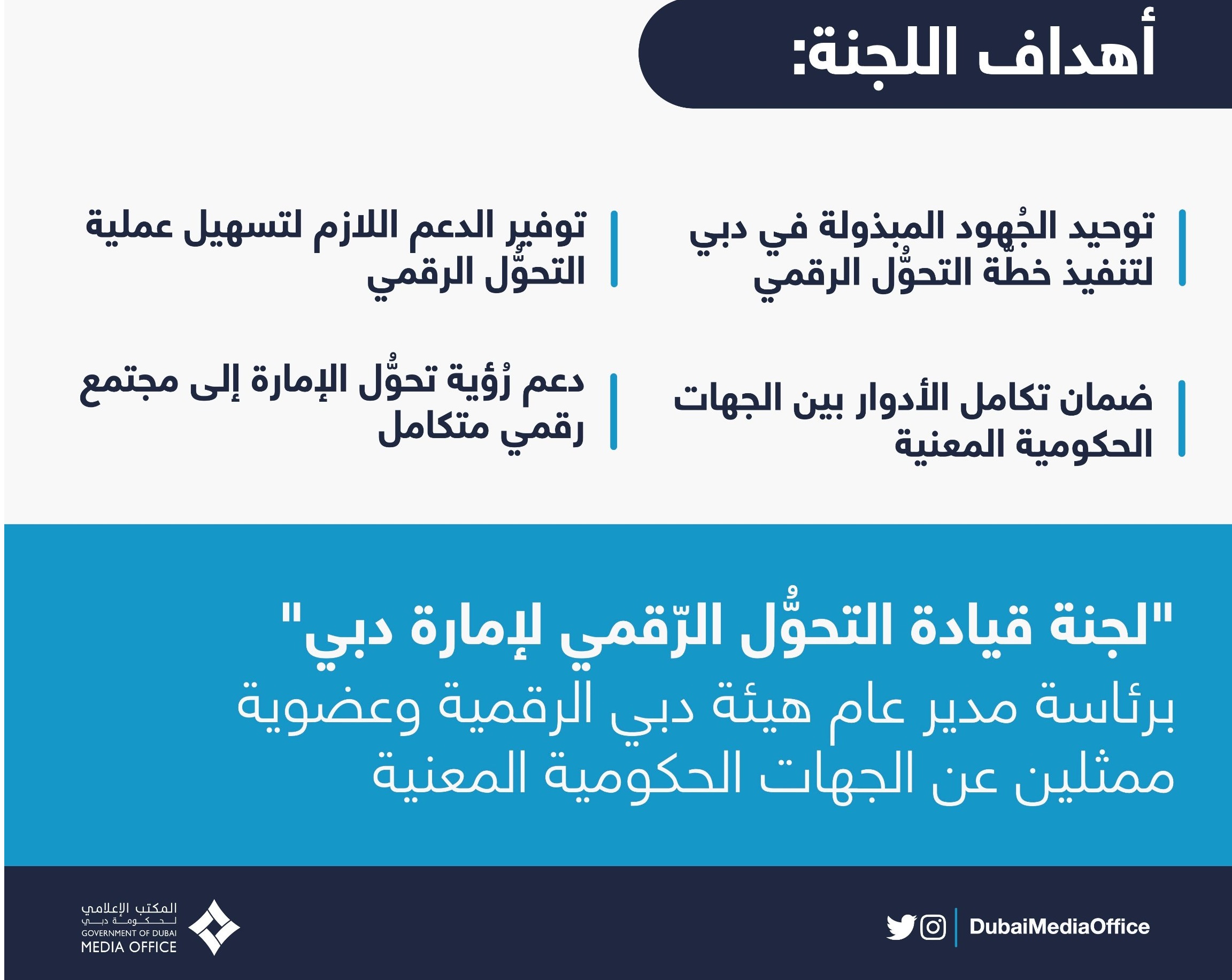 ونصّ القرار على تشكيل "لجنة قيادة التحوُّل الرّقمي لإمارة دبي"، برئاسة مدير عام هيئة دبي الرقمية، وعضوية مُمثِّلين عن كل من: الأمانة العامة للمجلس التنفيذي، ودائرة المالية، وهيئة الطُّرق والمواصلات، والقيادة العامة لشرطة دبي، وهيئة الصحة في دبي، وبلدية دبي، وهيئة كهرباء ومياه دبي، ودائرة التنمية الاقتصادية، ودائرة جمارك دبي، ودائرة السياحة والتسويق التجاري، والإدارة العامة للإقامة وشؤون الأجانب بدبي، ودائرة الأراضي والأملاك، ومحاكم دبي، على أن تتم تسمية مُمثِّلي الجهات الحكومية الأعضاء في اللجنة من قِبَل مسؤوليها بالتنسيق مع هيئة دبي الرقمية.